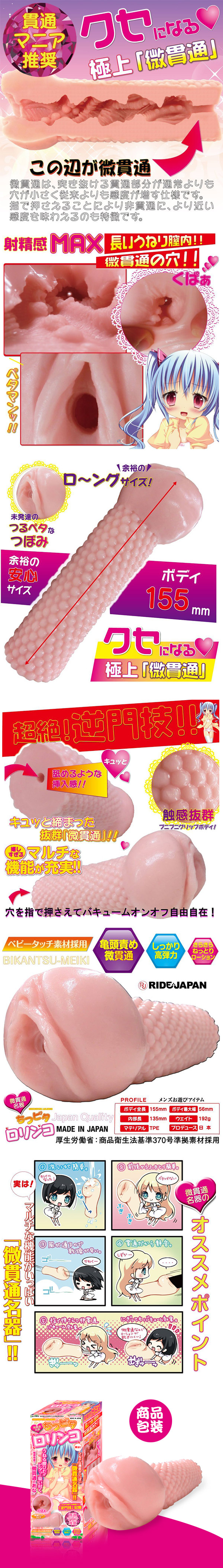 ちっちゃなボディながら、マルチな機能がいっぱい詰まったオナホール「微貫通名器ちつピタロリンコ」。 ベビータッチ素材を使用したボディはプニプニの感触で、可愛らしい入り口から挿入すると、螺旋状にうねる膣ひだが全体にピタッと吸い付いて刺激。 しかも、貫通穴が通常より狭い微貫通仕様なので、従来よりも感度がアップし、穴を指で押さえると、非貫通に近い感触を味わうこともできちゃいます。 射精感MAXのクセになりそうな快感を、思う存分お楽しみ下さい。。