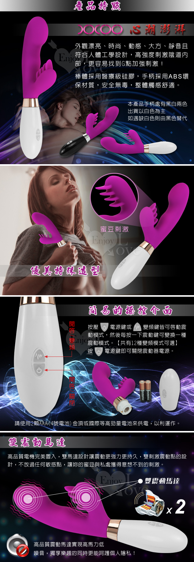 外觀漂亮、時尚、動感、大方、靜音、符合人體工學設計,高強度刺激陰道內部,更容易找到g點加強刺激。 棒體採用醫療級硅膠,手柄採用abs環保材質,安全無毒,整體觸感舒適。 內置優良馬達提供強大動力,12種不同的震動強度可分別,針對前戲、中段、高潮而任意調節。 矽膠手感極好,一觸摸到她就能讓您心潮澎湃,迫不及待地去領略她的風采。 溫馨浪漫又熱烈奔放,快樂感受無法言喻,只有親自體驗了才能感知他的無限魅力。 獨特按摩頂端帶來極致狂野,隨時隨地近乎無聲的激情享樂。 可以同時刺激陰道和外'陰蒂,比傳統按摩棒刺激性更強大。 ★適用4號電池2顆,因為是12段變頻設計,所以敬請使用金頂或國際等高勁量電池來供電,以利運作。 ★詳細樣式及說明如圖片所示。