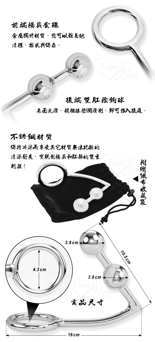 一款新型玩具,實現對睾丸和肛部的雙重刺激。 G點雙圓球為實心球。 通體均為實體鑄造,高級合金製作,給玩家從未體驗的金屬快感! ‧全長:約16cm,陽具環的內徑:4.3cm ,外徑:10.5cm ,球體的直徑是2.8cm ‧附有絨布收藏袋