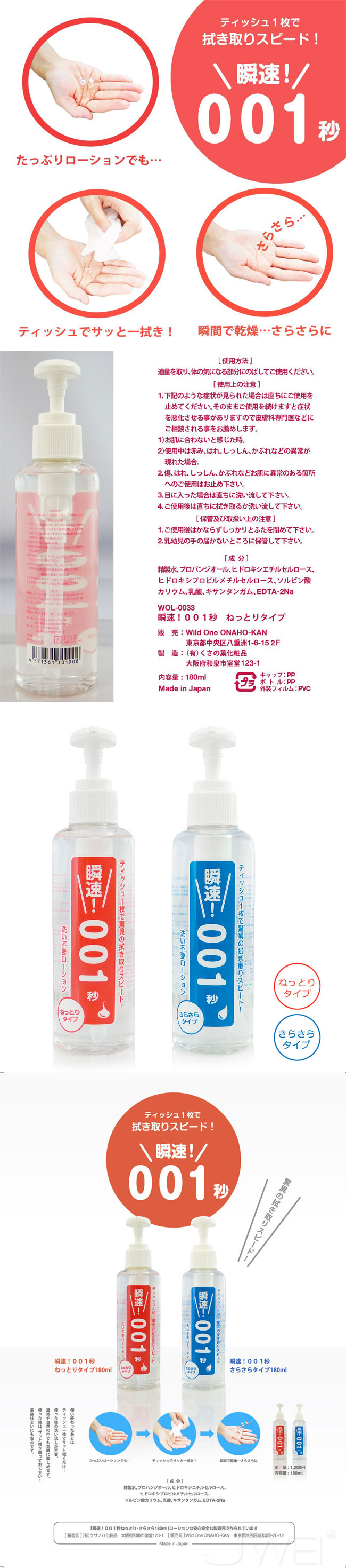 ►您現在的位置:首頁>日本原裝進口Wild One.洗い不要ローション 瞬速! 001秒 ねっとりタイプ 免清洗潤滑液 180ml -濃稠型