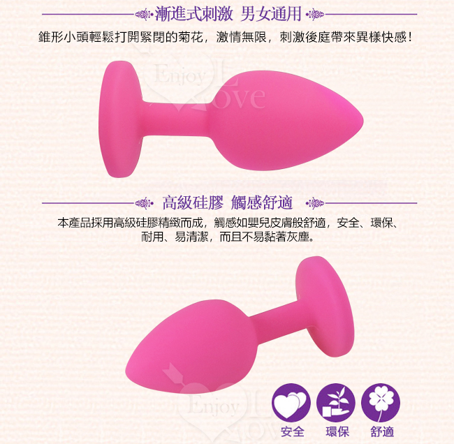 光滑的柔細表面,避免表皮的摩擦而受傷,同時進出更容易,最適合後庭初試者使用,可塞入私密處或肛門使用。