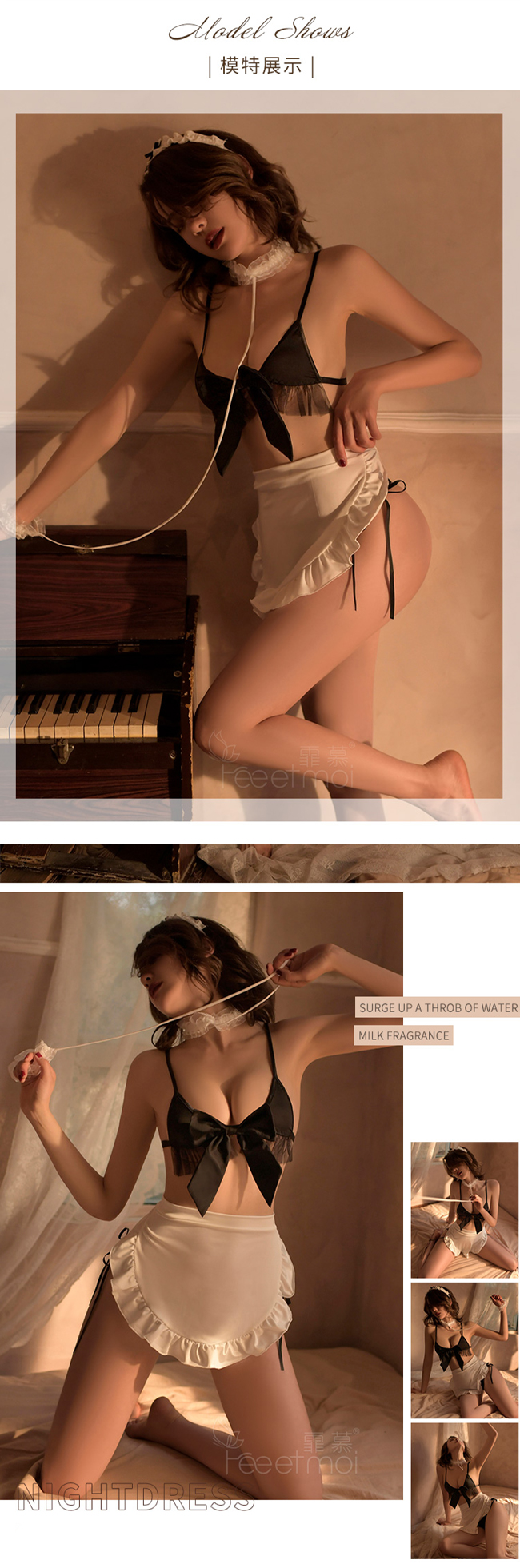 女僕角色扮演服!頸環牽引蝴蝶結美胸綁帶丁字褲五件式套裝