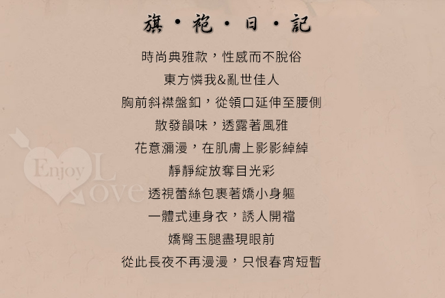 ►您現在的位置:首頁>情趣連身衣!典雅旗袍胸前斜開襟盤釦緹花透膚含網襪兩件組