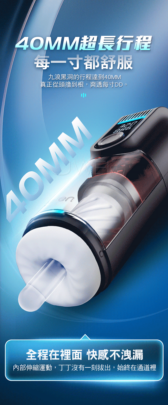 9+9狂浪聲吟,沉醉快感三重境,創新的角色與場景發聲,空服員、女 僕、車震等多種體驗,帶來立體式的第三重境界快感。黑洞吮吸技術 ,暢享深喉快感,創新的宮口收縮技術,利用空氣負壓吮吸,深處緊 緊吸住蘑菇頭,爽到拔不出來;緊嫩絲滑摸一下都興奮,柔軟Q彈,緊 緊包裹真舒服,紋理顆粒,宛如真人感受;創新的智慧雙螢幕,清晰 記錄你的 戰鬥時間,等級、速度;九浪黑洞的行程達到40mm真正從 頭擼到根,爽透每寸DD。
