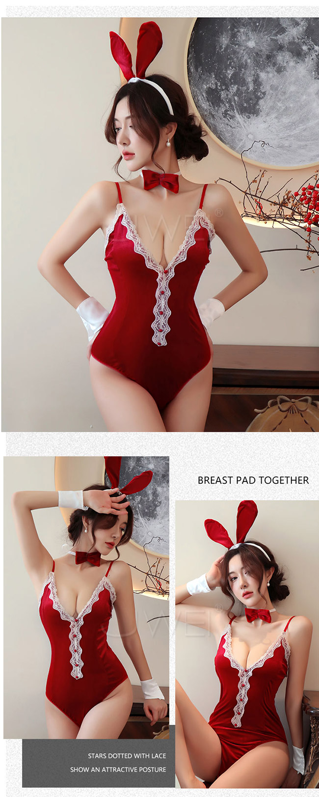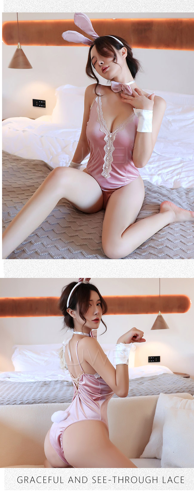 ◇◆蜜桃魅影.性感蕾絲深V露背側高叉兔女郎連身衣4件組(粉色)◆◇