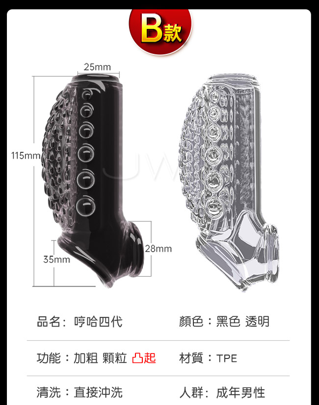 哼哈4代猛男套,顆粒環繞,凸起流線造型,密集水滴顆粒,兩側大圓珠剮蹭,柔軟貼合親 膚;降敏加時,挑戰持續輸出刺激,鎖蛋固莖衝刺不落,加粗加強夠粗夠硬,龜頭依然爽, 肆意玩耍,降低敏感度,摩擦變身猛男!