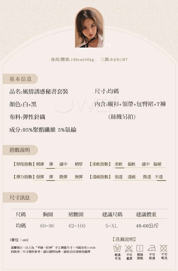■內容物:襯衫x1、領帶x1、包臀裙x1、T褲x1(長筒絲襪另選購)