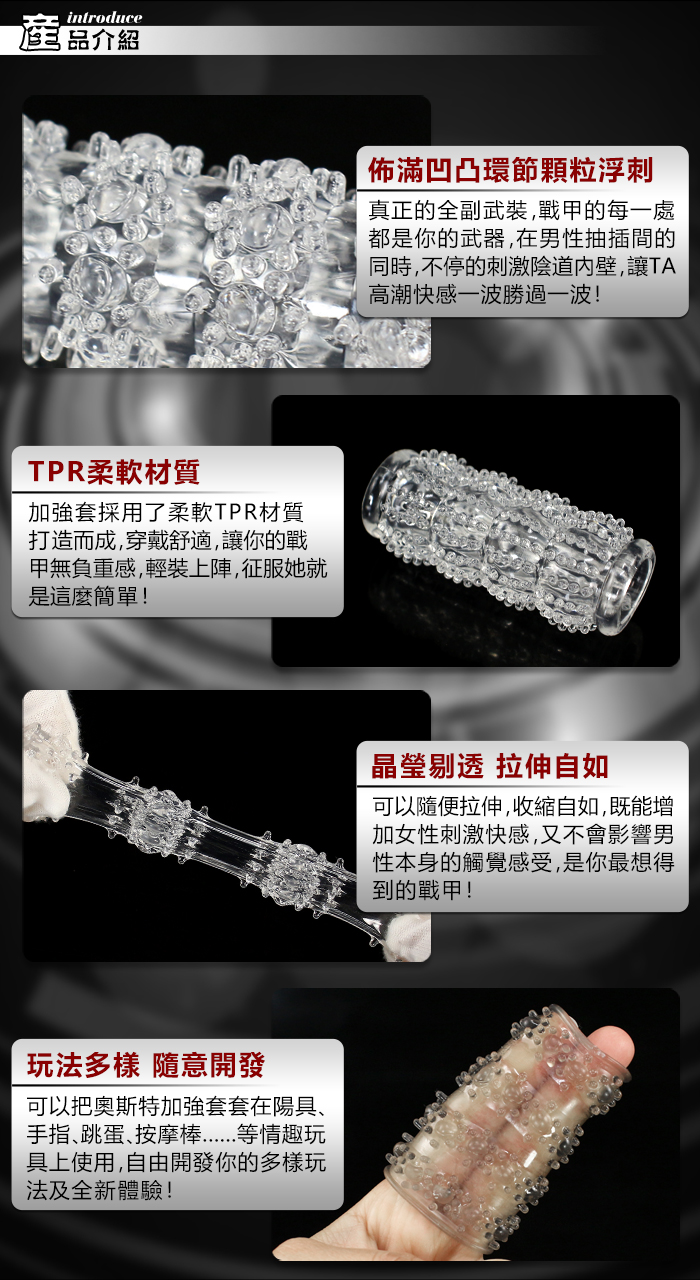 | 奧斯特 ‧ 老二加強戰鬥套 特殊凹凸環節顆粒浮刺刮蹭刺激增粗水晶套﹝兩款造型/愛愛強化提升雙套組﹞透明色