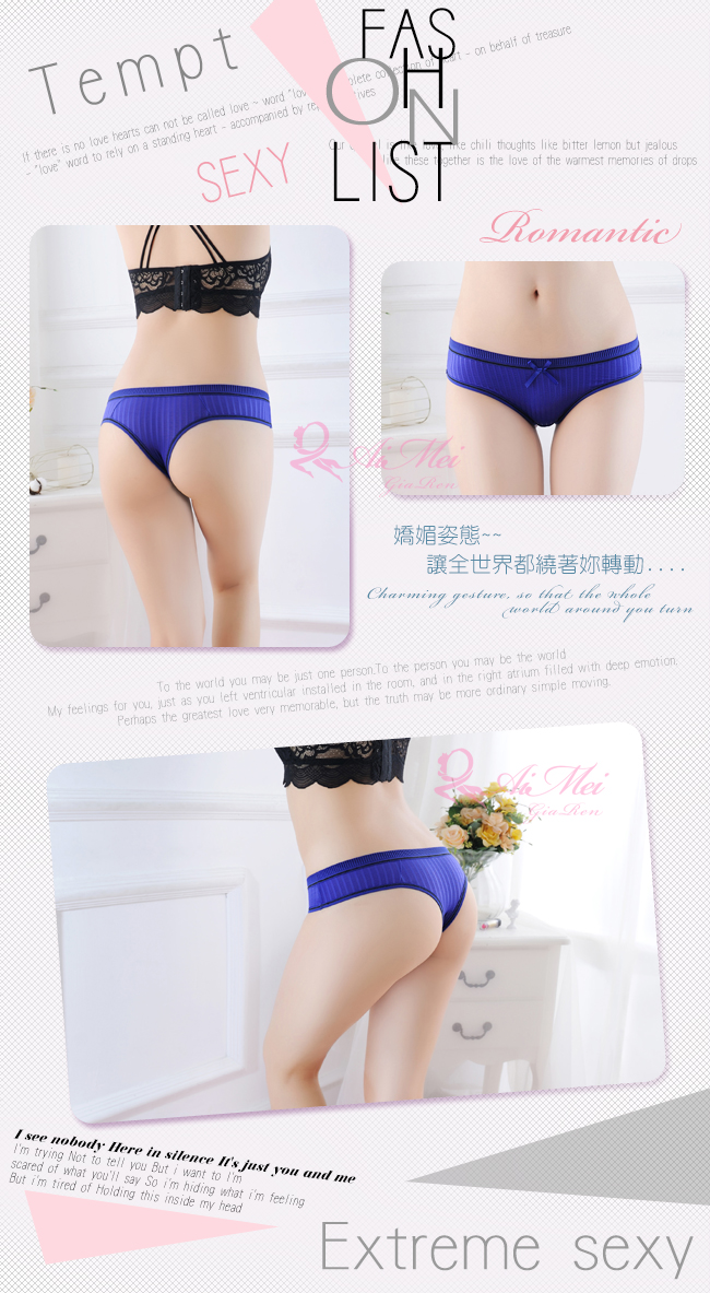 這樣的美麗,妳的他捨得與別人分享嗎? 獨佔這個專屬於彼此的夜晚吧~ ※ 內褲款式:T字褲。 ※ 設計特色:直條壓紋。 ※ 商品材質:100%POLYESTER。 ※ 功 能:性感、美體。 ※ 腰 型:低腰。 ※ 顏 色:寶藍色。 ※ 商品尺碼:FREE SIZE (適合腰圍23~29吋)。 ※ 長度單位換算 : 1吋=2.54cm。 ※ 注意事項:基於保障消費者個人衛生,此貼身衣物恕不接受退換貨,謝謝您! (如為商品本身暇疵,接受七日內換貨,請勿試穿,謝謝您)