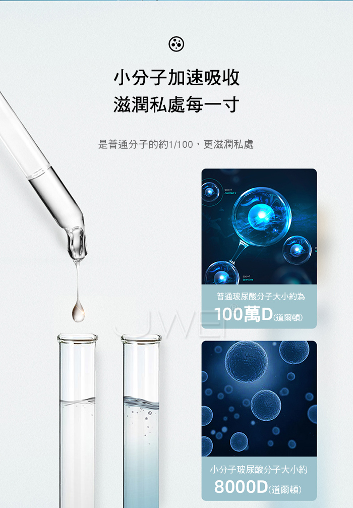 玻尿酸鎖水分子,攜帶500倍以上水分,由內而外深層滋潤私處,形成透氣薄膜層,阻止水分流失,鎖住更多水分