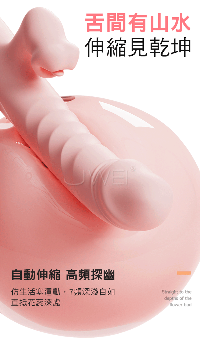 自動伸縮 高頻探幽,仿生活塞運動,7頻深淺自如,直抵花蕊深處 靈舌吻戲 厚實貼合,加厚仿生舌設計精準包覆荳蔻,紋理平滑革新再無夾肉之憂 360度包裹動感裹吸新體驗,閉眼沉浸如戀人在身旁的親密濕吻~ ■尺寸:大小詳如圖片標示 ■材質:矽膠+ABS ■功能:7頻震動、7頻舌舔、加溫